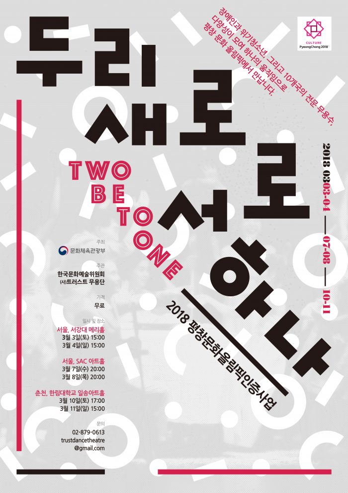 사단법인 트러스트 무용단(단장 김형희)은 3월 3일부터 11일까지 ‘2018 평창 문화올림픽 인증사업(이하 평창 문화올림픽)’의 일환으로 ‘두리새로 서로하나’ 공연 프로젝트를 개최한다고 밝혔다. 트러스트 무용단은 지난 1995년 창단된 무용단으로, 장애인 무용단 ‘케인앤무브먼트’를 주축으로 창작과 공연, 교육, 나눔, 국제교류 사업 등을 진행한다. 한국문화예술위원회가 후원하는 평창 문화올림픽은 이번 평창 동계올림픽·패럴림픽대회 기간을 전후로 전 세계 사람들이 참여할 수 있는 문화, 엔터테인먼트, 축제, 교육 등 문화 프로그램을 통칭한다.