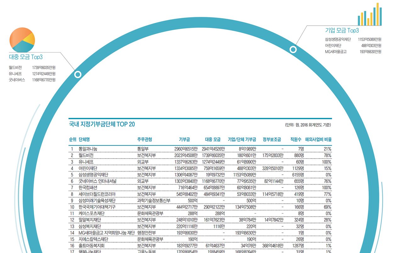 전문가들은 “현재 부처별로 관리·감독되는 지정기부금 단체 시스템이 구멍이다”고 지적한다. 이에 더나은미래는 2016년 국세청 공시 자료를 바탕으로 지정기부금 단체 상위 20곳, 정부 부처 17곳(신설된 중소벤처기업부는 제외) 중 상위 10곳을 전수조사하며 비영리 지형도를 분석해봤다.