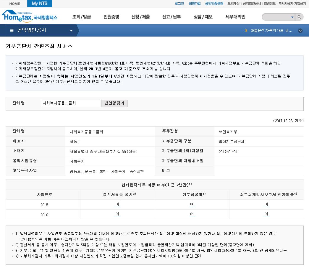 2016년 기준 5742억원을 모금한 기부금 수입 1위 단체인 ‘사회복지공동모금회’를 검색하면 대표자 이름과 주무관청, 기부금단체 구분, 소재지 등 간단한 정보를 확인할 수 있다. 자세한 정보를 확인하려면 국세청 공익법인 결산서류 공시 자료를 확인하거나, 한국가이드스타에서 해당 단체를 검색하면 된다.