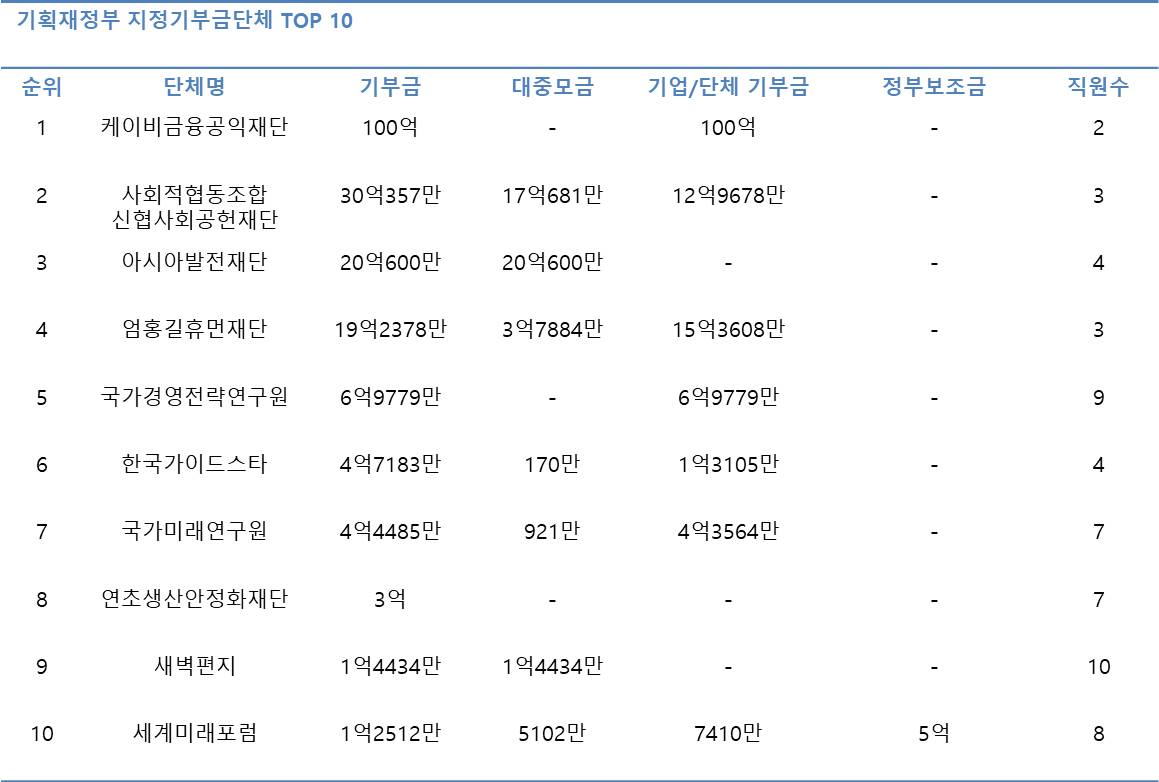 기획재정부 산하에선 KB금융공익재단이 기부금 100억원으로 가장 규모가 컸다. KB금융그룹에서 2011년 200억원 규모로 설립한 KB금융공익재단의 총자산은 767억9000만원 상당으로, 경제 금융 교육 사업, 장학 사업, 취업 학교 운영 등에 26억원을 지출했다. 이어 사회적협동조합 신협사회공헌재단(30억357만), 아시아발전재단(20억600만), 엄홍길휴먼재단(19억2378만) 등 1년 기부금 규모가 10억이 넘는 곳이 총 4곳에 그쳤다.
