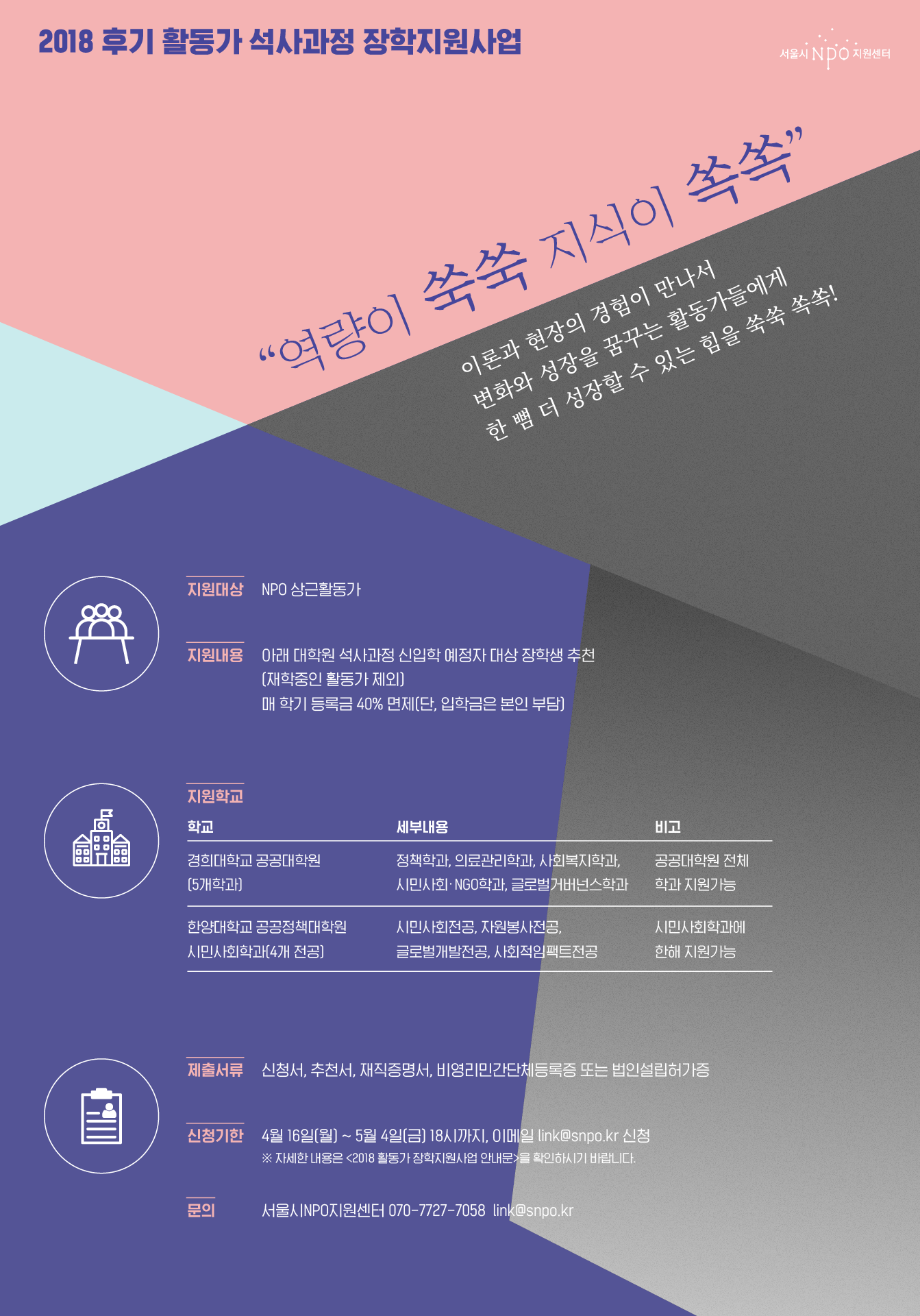 서울시NPO지원센터가 NPO상근활동가의 역량강화를 위해 경희대학교 공공대학원한양대학교 공공정책대학원과 함께 활동가 장학지원사업을 진행한다. 비영리민간단체 및 비영리공익법인, 사회적경제영역(사회적협동조합, 사회적기업), 복지영역, 중간지원조직 등에 재직 중인 공익활동가를 대상으로 하며, 3년차 이상 경력 활동가를 우대한다.