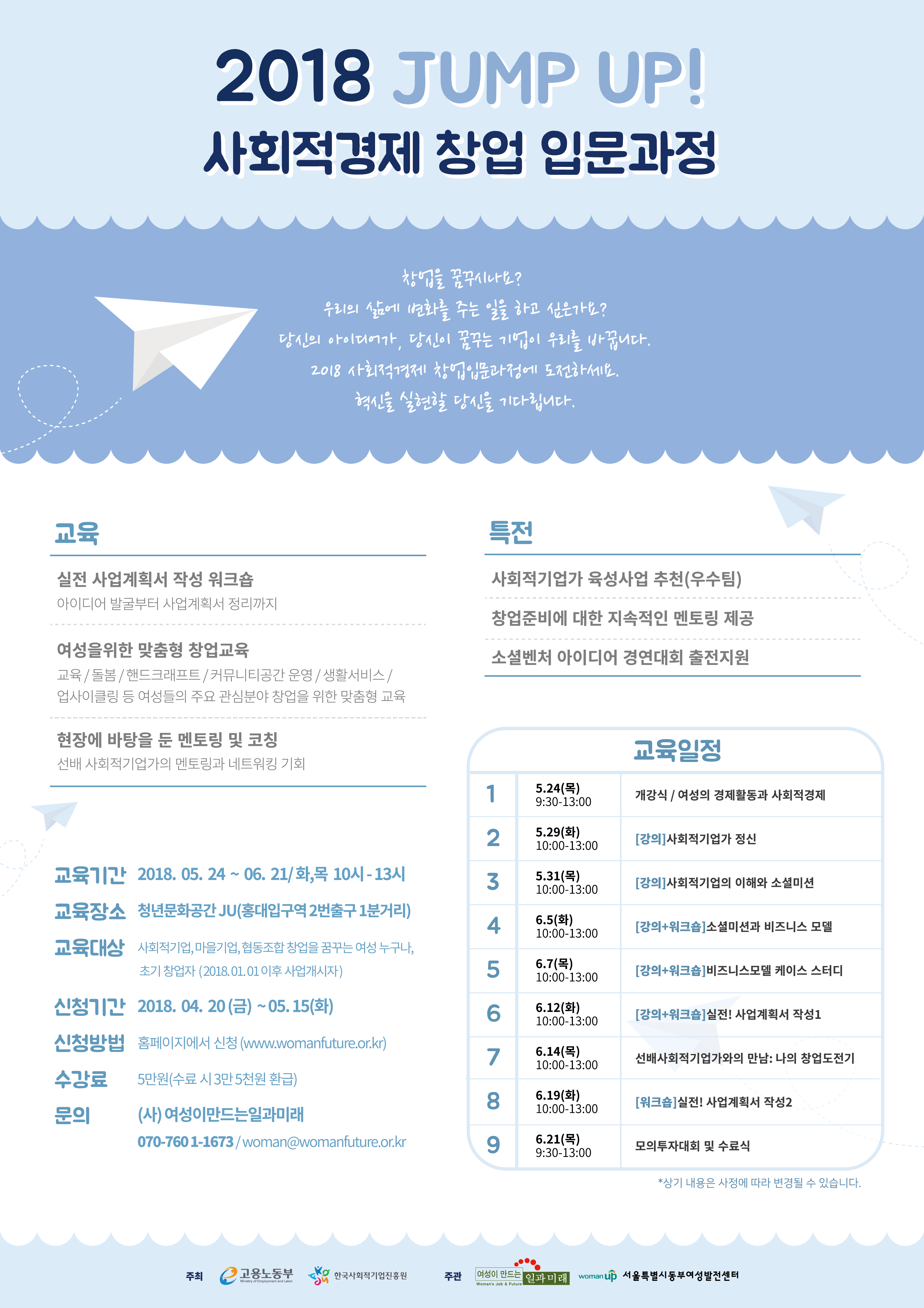 (사)여성이만드는일과미래에서 다음달 15일까지 ‘2018년 여성특화 사회적경제 창업입문과정’ 수강생을 모집한다.  사회적기업, 마을기업, 협동조합 창업을 꿈꾸는 여성기업가(2018년 1월 1일 이후 사업개시자)를 대상으로 하며, 교육과정은 5월 24일부터 6월 21일까지 진행된다. 실전 사업계획서 작성 워크숍부터 여성, 돌봄, 수공예 등 여성들의 주요 관심분야 창업을 위한 맞춤형 교육 과정으로 설계돼있다. 교육 프로그램을 수료한 수강생에게는 고용노동부 사회적기업가 육성사업에 추천되며, 소셜벤처 아이디어 경연대회 출전도 지원해준다. 수강료는 5만원이며, 수료 시 3만5000원은 환급받는다. ☞교육 과정 참가신청하기