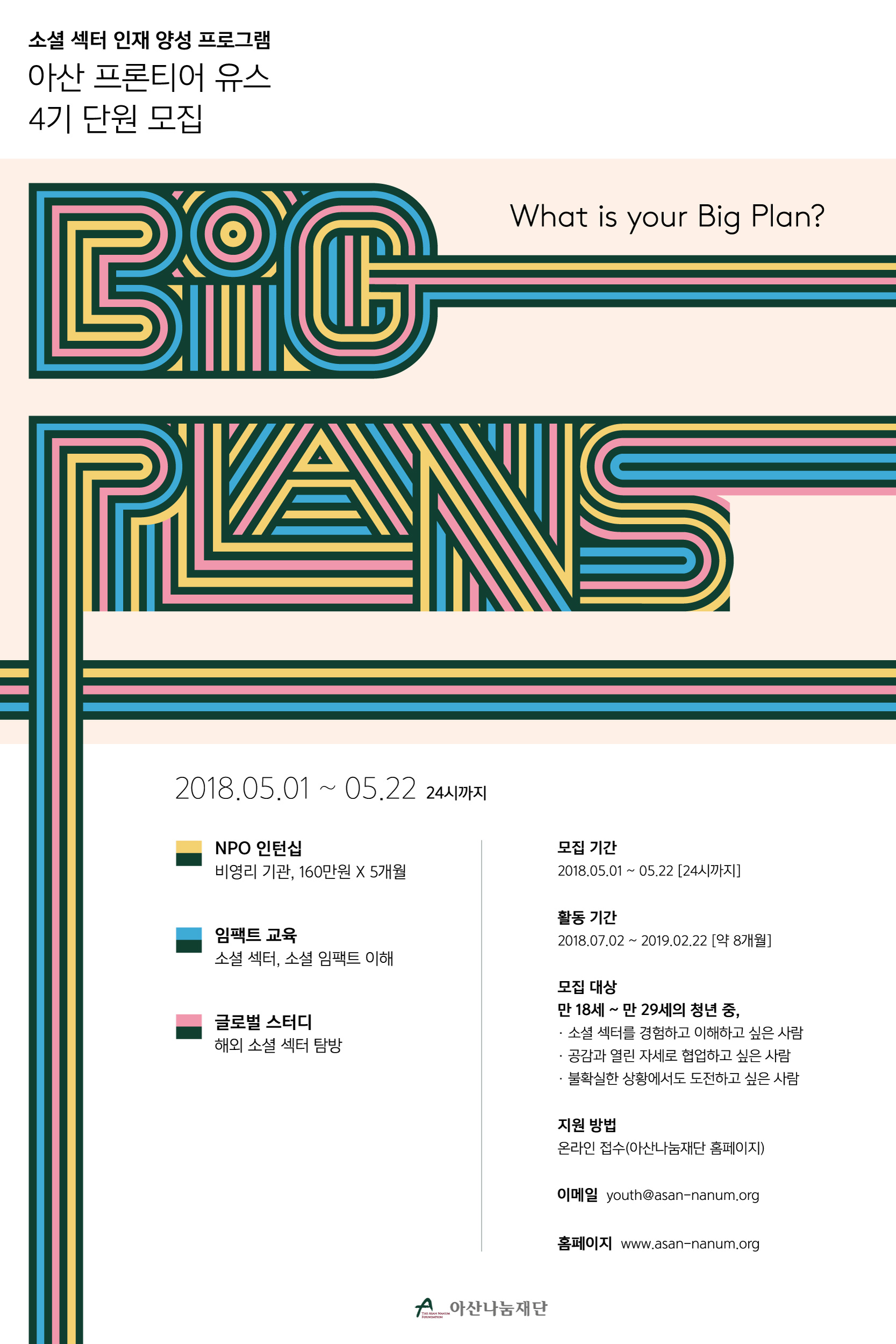 아산나눔재단 5 1일부터 22일까지 3주간 차세대 비영리 인재 양성 프로그램 ‘아산 프론티어 유스(Asan Frontier Youth) 4기 단원을 모집한다비영리 분야에 관심이 있는 열정적인 대한민국의 만 18세에서 29세 사이의 청년이라면 누구나 지원할 수 있다서류와 면접 전형을 거쳐 최종 선발된 20명은 오는 7월부터 내년 2월까지 약 8개월간 아산 프론티어 유스 단원으로 활동하게 된다이들에게는 ▲비영리기관 인턴십 ▲임팩트 교육 ▲글로벌 스터디 등의 기회가 주어진다. 인턴십은 ‘드림터치포올’‘서울시 NPO 지원센터’‘한국YWCA연합회’ 등 총 20개 비영리기관에서 7월부터 5개월간 진행되며 160만 원의 활동비도 지급된다모든 교육과정이 마무리되면 글로벌 스터디를 위해 9 10일간 해외 유수 비영리기관을 직접 방문한다. 5월 9일, 11일, 16일, 18일 4회에 걸쳐 아산나눔재단 신당동 사옥 1층 교육장에서 설명회가 개최된다.