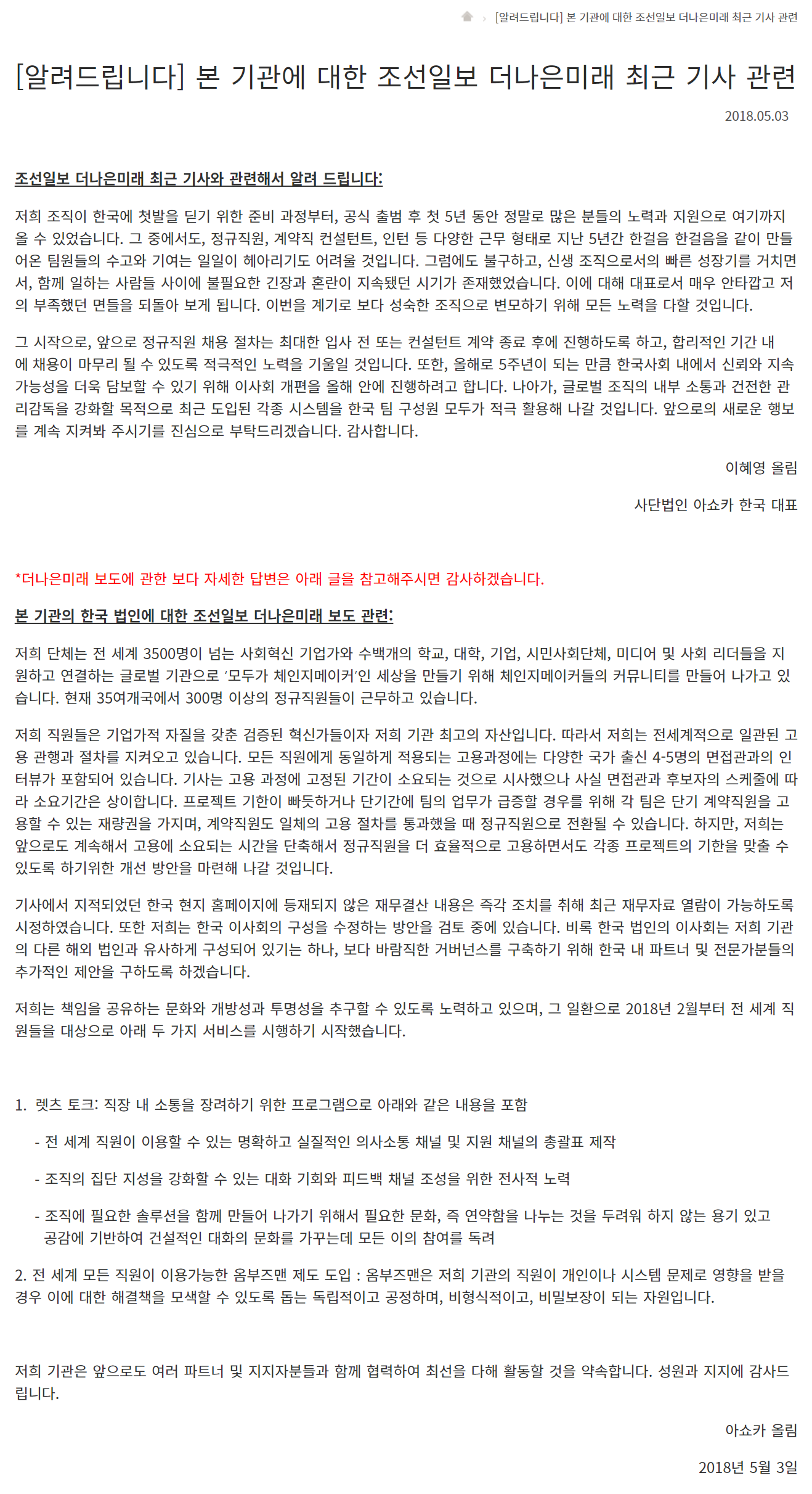 이와 관련 ▲정규직원 채용 절차를 입사 전, 혹은 컨설턴트 계약 종료 후에 진행 ▲올해 안에 이사회 개편 ▲글로벌 조직의 내부 소통과 건전한 관리감독을 강화할 목적으로 각종 시스템 도입 등을 약속했다. 이하 사단법인 아쇼카 한국의 공식 입장문 전문.