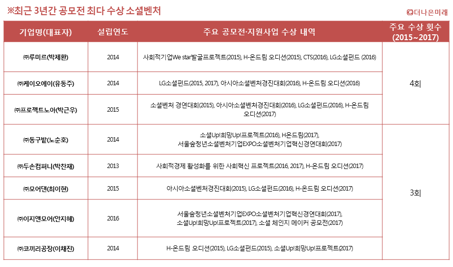 올해부터 시작된 공모전만 5개일 정도로, 소셜벤처 창업 공모전 전성시대다. 더나은미래는 최근 3년(2015~2017년)간 주요 소셜벤처 공모전·지원사업(총 13개)에서 수상한 기업들을 전수조사했다. 그 결과 ㈜루미르와 ㈜케이오에이, ㈜프로젝트노아(닥터노아) 총 3곳의 기업이 4번을 수상했고, 이어 ㈜동구밭, ㈜두손컴퍼니, ㈜모어댄, ㈜이지앤모어, ㈜코끼리공장 5개 기업이 공모전에서 3번 수상한 것으로 나타났다.