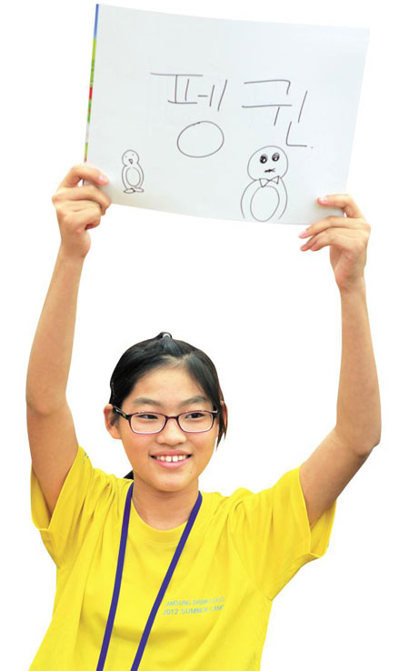 “다 적었으면 머리 위로 스케치북을 들어주세요. 자~ 하나, 둘, 셋. 네~ 정답은 ‘동전(coin)’입니다.”