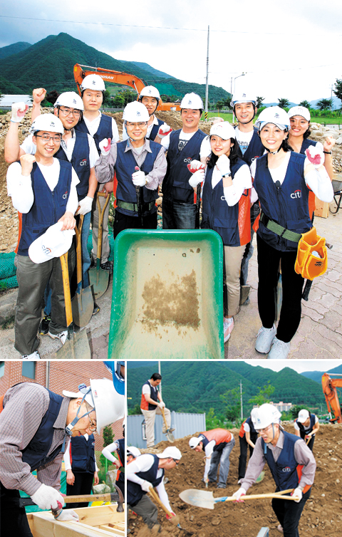 2시간여 만에 도착한 인제군 북면 원통리에는 한국해비타트 이창식 회장과 김영미 사무국장이 한국씨티은행 직원들을 기다리고 있었다. 이창식 회장은 “한국씨티은행은 한국해비타트의 가장 오래된 기업 파트너”라며 “글로벌 외환위기 때도 지원을 끊지 않고 13년째 물심양면 노력하고 있는 회사”라고 칭찬했다. 한국씨티은행은 13년째 700여명의 직원이 자원봉사에 참여, 광양·삼척·대구·군산·태백·춘천·대전 등에서 총 19세대의 ‘희망의 집’을 지었다. 이날 한국씨티은행은 노력봉사는 물론이고, 한국해비타트에 11만6000달러(약 1억4000만원)의 후원금을 전달했다.