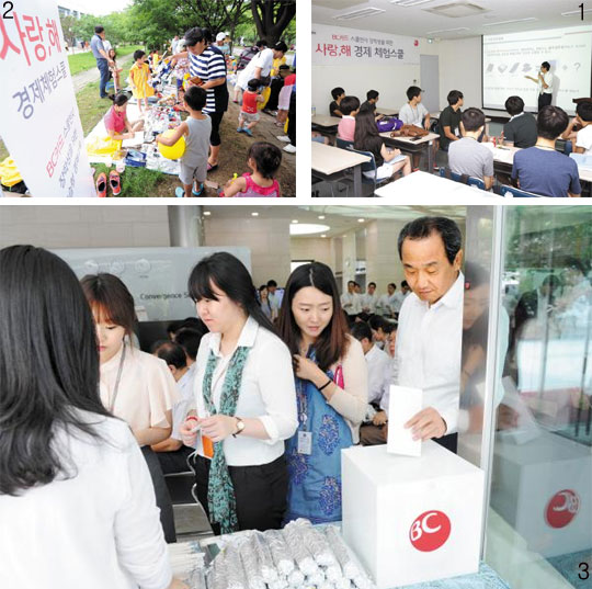 BC카드의 사회공헌 활동은 1990년대로 거슬러 올라간다. 카드 이용액 일부를 기금으로 적립해 저소득층 청소년들에게 장학금을 지급해온 것. 2011년부터는 청소년 자립 지원 및 교육 프로젝트인 ‘사랑,해 스쿨천사’를 진행하고 있다. 기초생활수급권자, 차상위계층, 다문화, 조손 가정 등 저소득층 학생 180명을 선발해, 매월 10만원씩 총 140만원의 장학금과 경제 교육을 지원한다. 올해 장학생으로 선발된 송윤호(가명·17)군은 “교육을 받고 평소 소비 습관을 돌아보게 됐다”고 말했다. 경비원인 아버지 밑에서 자란 윤호군은 넉넉지 않은 형편 때문에 친구들과 간식을 사 먹지도, 문제집을 살 수도 없었다. “3일간 ‘사랑의 경제체험스쿨’ 캠프에 참가하면서 모의 주식 체험을 하고, 무역과 환율 변동도 배웠어요. 교육받은 내용을 초등학생 멘티들에게 가르치고, 함께 바자회를 열어 수익금을 더 어려운 이웃에게 기부했죠. 저도 남을 돕는 삶을 살고 싶다는 생각이 들었습니다.”