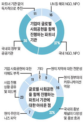 최근 국내 기업들의 사회공헌은 NGO·사회적기업 등 외부 기관을 배제한 채 독자적으로 진행되는 분위기다. 하지만 글로벌 사회공헌에서만큼은 기업과 외부 기관(NGO·NPO 및 정부)과의 파트너십이 강화되고 있다. ‘더나은미래’ 설문조사에 따르면, 글로벌 사회공헌을 ‘국내외 기관들과 함께 진행하고 있다’는 답변이 89%에 달했다. 그중 국내 NGO·NPO와 파트너십을 맺고 있는 기업이 37%(26곳)에 달했다. 굿네이버스, 플랜, 기아대책, 글로벌비전, 한국실명예방재단 등이 파트너 기관으로 주로 언급됐다. 국내외 정부 및 공공기관과 함께 진행하는 기업도 36%(25곳)로 높게 나타났다. GS칼텍스, KT, 교보생명, 삼익악기, 웹케시, CJ, 외환은행 등은 한국국제협력단(KOICA)을 대표 파트너 기관으로 꼽았다. 해외 비영리단체와 파트너십을 통해 사업을 진행하는 기업은 11곳(16%)으로 조사됐다. KT는 인도네시아 현지 사회적기업과 파트너십을 맺었고, 한국중부발전은 인도네시아 건설·전문 운영 NGO 이베카(IBEKA)와, LG전자는 WFP(세계식량계획)·UNDP(유엔개발계획)·IVI(국제백신연구소) 등 해외 비영리기관과 협력하고 있다. 11%(8곳)는 파트너 기관 없이 독자적으로 추진하고 있는데, SK이노베이션처럼 페루에 직접 NGO(Prosynergy)를 설립·진행하는 기업도 있어 눈길을 끌었다. 롯데백화점·현대건설·신한은행·포스코 등 3곳 이상의 정부 및 비영리단체와 협력하고 있는 기업이 13곳(36%)에 달해, 글로벌 사회공헌에서 파트너십의 중요성을 인식하고 있는 것으로 나타났다.