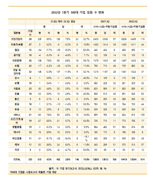 24일 기업분석연구소 리더스인덱스는 국내 매출 상위 500대 기업 가운데 올해 1분기 보고서를 제출한 353개 기업의 임원 현황 분석 결과를 발표했다. 분석 대상 기업 350여개의 임원은 총 1만 4418명으로 집계됐다. 이는 지난해 1분기(1만3803명)보다 4.5% 증가한 수치다.
