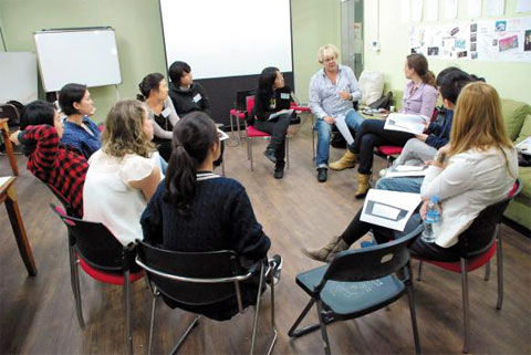 노매즈 학교의 교장 피터 스핀더(가운데)씨와 워크숍 참가자들이 토론하고 있다.