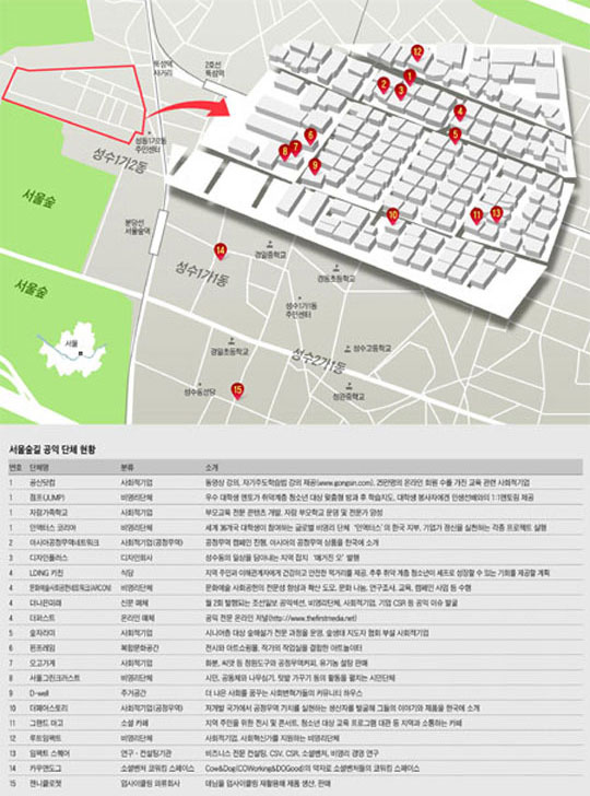 지난 8월, 정 대표는 ‘교육 관련 단체들을 한곳에 모아 시너지를 내는 사업을 벌여보자’며 공동 사무실(지도1)도 마련했다. 이곳엔 공신닷컴, 점프(JUMP), 자람가족학교, 인액터스 등 소셜 벤처들이 둥지를 틀었다. 연말까지 루트임팩트, 임팩트스퀘어(지도13), 소셜벤처 코워킹 스페이스인 ‘카우앤도그'(지도14) 등 젊은 사회혁신가들도 서울숲에 속속 자리를 잡을 예정이다.