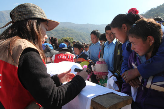 최성준(30·롯데홈쇼핑 경영기획팀)씨의 말에 구릿빛 피부의 소녀가 수줍은 듯 “메로남 무미까(제 이름은 무미까예요)”라고 답했다. 최씨가 하얀 티셔츠 위에 소녀의 이름을 쓰고 기린 한 마리를 그려 넣자, 이를 함께 지켜보던 소녀들이 까르르 웃음을 터트렸다. 최성준씨는 “대학 시절 방학마다 장애인 아동기관에서 봉사활동을 했는데, 재밌는 그림이나 캐릭터를 그려 주면 아이들이 참 좋아하더라”며 “산속에 사는 친구들이라 자연친화적인 동물 그림을 준비했다”고 했다. 미술을 전공한 송진섭(33·그래픽아트팀)씨는 캐리커처를, 평소 글씨에 자신 있었던 배현정(27·식품주방팀)씨는 ‘캘리그래피(글을 아름답고 개성 있게 표현하는 손글씨 기술)’ 솜씨가 새겨진 티셔츠를 선물했다. 네팔의 동쪽 산간마을 푸룸부의 ‘쓰리머얌’ 학교 건물 앞에 모여앉은 10명의 직원 모두, 길게 줄지어 선 100여명의 아이를 위해 구슬땀을 흘렸다. 이 학교의 사파나(14)양은 “산행을 위해 지나가는 외국인은 종종 봤는데, 직접 학교까지 찾아와 주신 분들은 처음”이라며 “낯선 이방인이지만, 언니·오빠처럼 살갑게 대해줘서 기분이 좋다”고 했다.