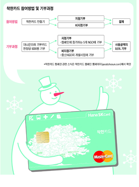 ‘착한카드 캠페인’에 참여하는 일은 착한 카드를 만드는 데서 시작된다. 캠페인 웹페이지(good.cho sun.com)를 방문해 착한카드를 신청하면 연회비가 자동으로 기부된다. 여기에 ‘더나은미래’도 힘을 보탠다. 카드 가입자 한 명이 늘 때마다 더나은미래 역시 5000원을 기부할 예정이다.