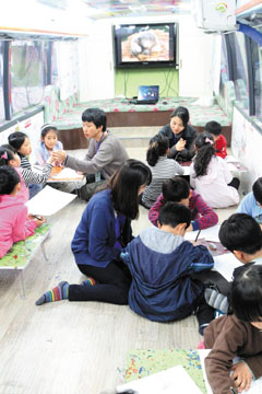 서울시 노원구 월계동 연지초등학교의 운동장 안으로 노란 버스 한 대가 미끄러지듯 들어와 한쪽 구석에 자리를 잡았다. 아이들 몇 명이 왁자지껄 수다를 떨며 차례차례 버스에 올라탔다. 내부를 개조해서 작은 공부방 같은 버스 안은 아이들이 조금만 떠들어도 웅웅거렸다. “1층에는 무당벌레, 2층에는 딱따구리, 3층에는 부엉이…. 어, 두더지 그리고 싶은데 어떻게 그리지?” 새나 벌레 등 학교 운동장에 살고 있는 동물들을 위한 집을 생각해보라는 말에, 여덟살 우섭이는 ‘동물 아파트’를 그리고 있었다. 이날 수업을 진행한 조각가 김재환(37)씨가 우섭이의 그림을 보고 “멋있네, 정말 잘했다”라고 칭찬하자 아이는 몸을 배배 꼬며 미소를 지었다. 아이들이 올라탄 노란 버스의 정체는 문화적으로 소외된 지역을 찾아가서 문화 창작 수업을 하는 일명 ‘아트버스(art bus)’다. 이 버스 안에서는 10주 동안 젊은 예술가와 아이들이 함께 공동의 창작물을 만드는 ‘아트버스 프로젝트’가 진행된다. 실력 있는 미술 작가를 발굴하고 이들의 해외 교류와 전시 등을 지원하기 위해서 만들어진 캔 파운데이션(Contemporary Art Network Foundation, 국제시각예술교류협회)이 기획한 이 프로젝트는 2009년 6월에 시작돼 벌써 2년째를 맞았다. 지난달 19일부터 시작된 김씨의 수업은 자신의 주변에 사는 동물들의 보금자리를 만들어 주는 것이 주제다. 버스에 올라탄 아이들은 컴퓨터와 TV를 통해 여러 벌레와 새들의 사진을 보고, 운동장으로 나와서 화단과 연못 등을 둘러봤다. 김씨를 비롯해 다른 지도교사의 말을 잘 듣던 저학년 아이들과 달리 고학년 아이들의 반응은 뜨뜻미지근했다. “저런 낙엽 밑에는 뭐가 있을까?”라는 김씨의 물음에 몇몇 남자아이들은 관심 없다는 듯