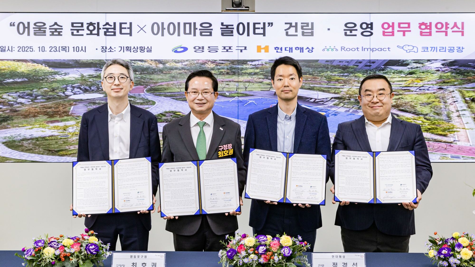 창립 70주년 기념 사회공헌 프로젝트…지자체·사회적기업과 손잡고 양육 커뮤니티 조성 현대해상화재보험(대표 이석현)이 창립 70주년을 맞아 아동과 양육자를 위한 열린 커뮤니티 공간을 만든다. 현대해상은 23일 영등포구청에서 영등포구, 사회적기업 코끼리공장, 사단법인 루트임팩트와 ‘어울숲 문화쉼터×아이마음 놀이터’ 건립 및 운영을 위한 업무협약(MOU)을 체결했다고 24일 밝혔다. ‘아이마음 놀이터’는 현대해상의 대표 사회공헌 프로젝트로, 지자체와 협력해 아동과 보호자가 함께 이용할 수 있는 복합문화공간을 조성하는 민관협력 사업이다. 단순한 놀이시설이 아니라 지역사회 구성원들이 함께 어울리고 성장하는 지속가능한 양육 커뮤니티 모델을 구축하는 것이 목표다. 이번 협약에 따라 서울 영등포구 어울숲근린공원 내에 커뮤니티 시설이 조성되며, 향후 3년간의 프로그램 운영까지 지원된다. 현대해상은 시설 건립과 운영을 위한 재정 지원을, 영등포구는 정책·행정적 지원을 맡는다. 코끼리공장은 설계·시공과 프로그램 운영을 담당하고, 루트임팩트는 프로젝트 기획과 연구를 맡는다. 이날 협약식에는 정경선 현대해상 지속가능경영담당(CSO)을 비롯해 최호권 영등포구청장, 허재형 루트임팩트 대표, 이채진 코끼리공장 대표 등이 참석했다. 정경선 CSO는 “현대해상은 어린이보험 1위 기업으로서 건강하고 행복한 육아의 동반자가 되고자 한다”며 “‘아이마음 놀이터’가 아동과 양육자, 지역사회가 함께하는 새로운 양육문화의 거점으로 자리 잡길 기대한다”고 말했다. 조유현 더나은미래 기자