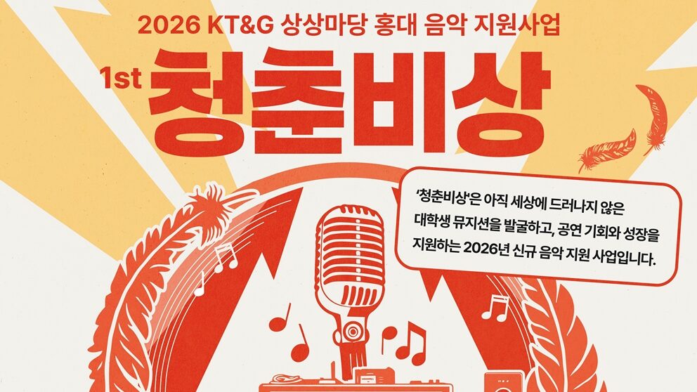 KT&G 상상마당이 신진 뮤지션을 희망하는 대학생을 발굴하고 육성을 지원하는 프로그램 ‘2026 청춘비상’ 공모를 오는 24일까지 진행한다. ‘청춘비상’은 올해 처음 선보이는 상상마당 홍대의 음악 지원 사업으로, 대학생 뮤지션을 대상으로 공연 제작과 아티스트 협업 기회를 제공해 창작 활동을 돕기 위해 기획됐다. 지원 자격은 멤버 전원이 대학생 또는 학점은행제 이수 중인 구성원으로 이루어진 팀이면 누구나 지원할 수 있으며, 타 학교 학생들과 연합 팀 구성도 가능하다. 참가 신청은 3월 23일부터 4월 24일까지 약 4주간 진행되며, 이와 관련한 자세한 정보와 접수 방법은 KT&G 상상마당 홈페이지와 공식 인스타그램에서 확인할 수 있다. 최종 선발은 총 2개 팀으로, 선정된 팀에게는 팀당 상금 200만 원이 지원되며, 평일 무료 대관과 현역 뮤지션과의 컬래버레이션 공연 기회가 제공된다. KT&G 김천범 문화공헌부 공연 담당 파트장은 “‘청춘비상’은 뮤지션을 꿈꾸는 대학생들에게 무대 경험을 쌓고 음악적 역량을 넓힐 수 있는 프로그램”이라며 “앞으로도 다양한 프로그램을 통해 신인 아티스트 발굴과 육성에 지속적으로 노력할 것”이라고 말했다. 한편, KT&G 상상마당은 신진 예술가들의 창작활동을 지원하고 대중들에게 폭넓은 문화 경험을 제공하는 복합문화예술공간이다. 지난 2005년 온라인 상상마당을 시작으로 홍대∙논산∙춘천∙대치∙부산까지 총 5곳에서 운영되며 문화예술 저변 확대와 지역문화 발전에 기여하고 있다. 상상마당은 연간 매년 3000여 개의 문화예술 프로그램이 운영되고 있다. 조유현 더나은미래 기자