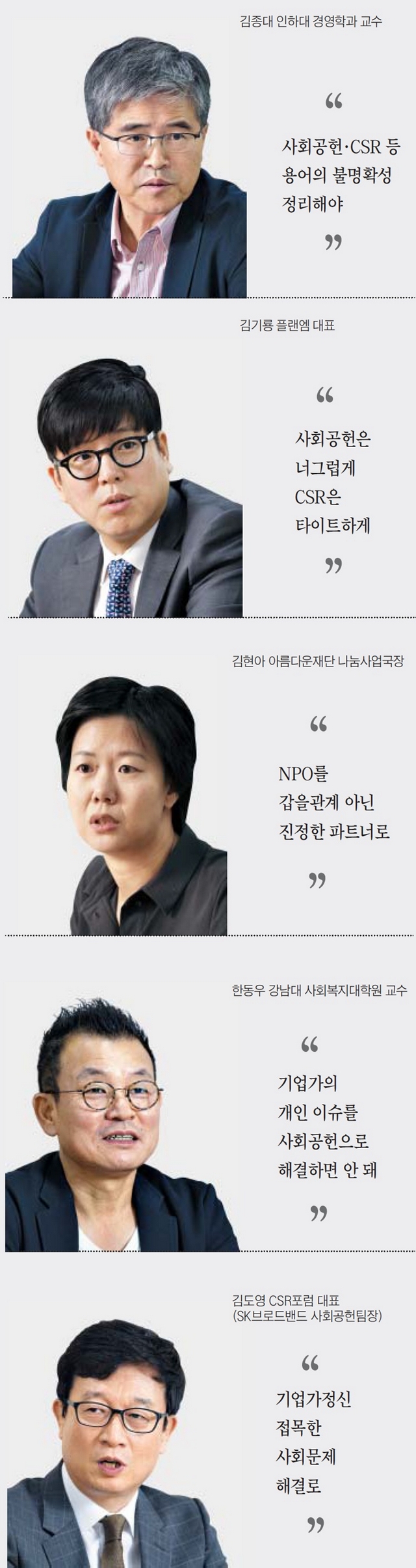 전문가 특별 좌담회 지난 10년간 국내 기업의 사회공헌은 어떻게 변화해왔을까. 아름다운재단이 국내 매출액 2000대 기업 400곳의 사회공헌 실태를 분석한 결과, 기업 10곳 중 9곳이 사회공헌을 해봤고, 사회공헌 담당자를 두고 있는 기업이 절반을 넘어섰다. 자선·봉사로 시작된 사회공헌이 3조원 규모로 성장하기까지, 지난 10년간 발견된 양적·질적 변화는 무엇일까. 조선일보 더나은미래와 아름다운재단은 ‘기업 사회공헌 10년, 이대로 괜찮은가’를 주제로, 전문가들과 함께 기업 사회공헌의 향후 10년을 그려보는 특별 좌담회를 열었다. 박란희 더나은미래 편집장의 사회로 열린 이날 좌담회에는 김기룡 플랜엠 대표, 김도영 CSR포럼 대표(SK브로드밴드 사회공헌팀장), 김종대 인하대 경영학과 교수, 김현아 아름다운재단 나눔사업국장, 한동우 강남대 사회복지대학원 교수(가나다순)가 참석했다. 사회=국내 기업 사회공헌의 지난 10년을 어떻게 평가하는가. 한동우=기업 사회공헌의 10년치 통계를 분석한 결과 한국 기업의 사회공헌 평균 참여율은 90%, 그중 이듬해에도 사회공헌을 지속하는 기업이 92%로 높게 나타났다. 전반적으로 사회공헌이 늘고 있고, 많은 기업이 참여하는 건 분명하다. 그동안 ‘한국 기업 사회공헌은 대기업 12곳이 한다’는 이야기가 나올 정도로 대기업 편중이 심했는데, 최근 중소기업으로까지 사회공헌이 확대되고 있다. 대기업의 기부금은 매출액이나 당기순이익과 관련성이 높은 반면, 중소기업은 이익과 상관없이 독립적으로 기부를 결정하는 것으로 조사됐다. 김기룡=현장에서 느끼기에 사회공헌의 양적 성장은 수치상으로 나타나지만, 질적으론 10년 전과 크게 달라지지 않았다. 사회공헌 테마와 해결하려는 사회문제는 달라졌지만, 프로그램은 비슷하다. 다만, 결식 아동을 돕기 위해 행복도시락, 도너스캠프 등 솔루션이 나왔고 그 후에 정책적으로 바우처 제도가 실시된 사례에서도 보듯, 기업 사회공헌이 다문화,