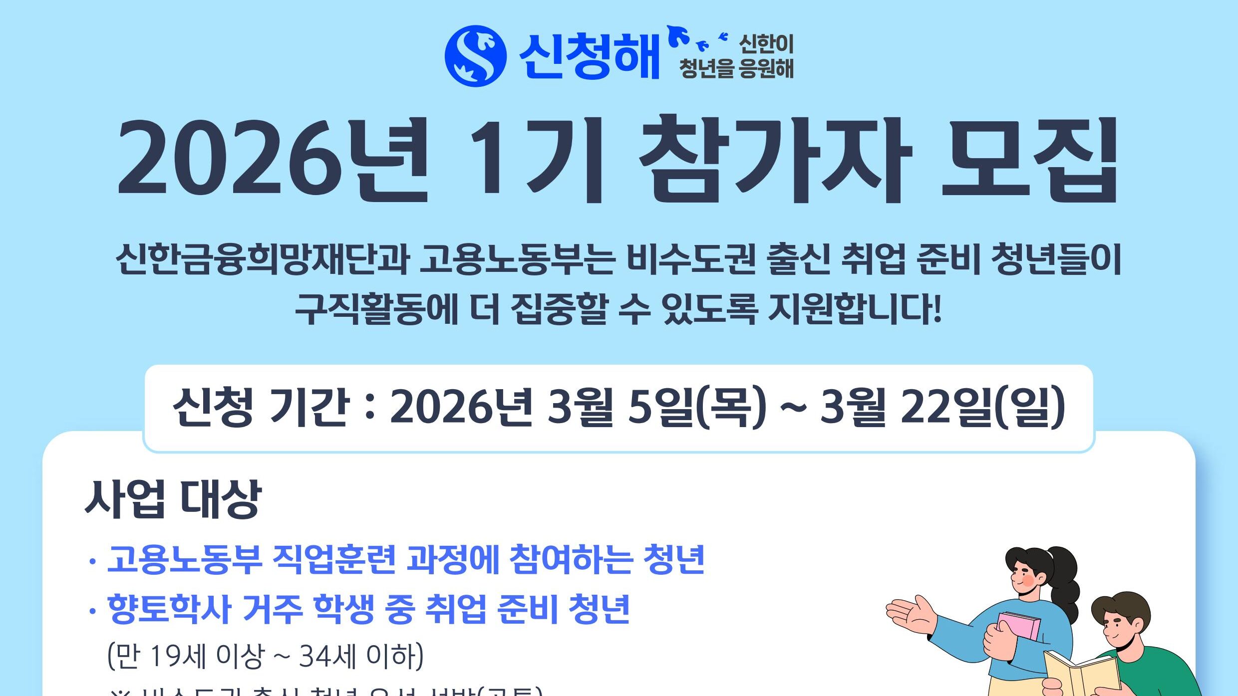 신한금융희망재단(이사장 진옥동)은 5일부터 22일까지 경제적 여건이 어려운 취업준비 청년들을 지원하는 ‘신한이 청년을 응원해’ 사업의 1차 지원자를 모집한다. ‘신한이 청년을 응원해’는 경제적 여건이 어려운 비수도권 출신 청년들에게 수도권 내 주거비, 교통비 등의 생활비 및 학습공간 이용비를 지원해 안정적인 취업준비를 독려하는 사업으로 지난해까지 총 3239명의 청년에게 약 27억 원을 지원했다. 지원대상은 중위소득 80% 이하 가구의 취업준비 청년 중 고용노동부 직업교육훈련 참여자 및 지방 출신 인재들의 취업준비를 위한 숙소인 향토학사 거주 청년이다. 선발인원은 분기마다 600명씩 총 3차례로 나눠 1800명을 선발하고 선발된 청년들에게는 1인당 생활비 최대 150만 원(300명), 학습공간 이용비 최대 60만 원(300명)이 지원되며, 1회에 한해 중복 참여가 가능하다. 특히 올해는 고용노동부 K-디지털 트레이닝 ‘AI 캠퍼스’ 운영에 맞춰 해당 과정에 참여하는 취업준비 청년을 대상으로 지원을 확대할 계획이다. 이를 통해 디지털·AI 관련 분야에 취업을 희망하는 청년들에게 학습 지원과 생활 안정을 도모하고 정부 정책에 발맞춰 AI 인재 양성에 적극 동참할 예정이다. 신한금융희망재단 관계자는 “신한금융은 취업을 준비하는 청년들이 주거비와 교육비 등 경제적 부담을 덜고 꿈을 향해 나아갈 수 있는 실질적인 기회의 사다리를 제공하겠다”며 “앞으로도 우리 사회의 미래인 청년들이 경제적 여건으로 소외되지 않도록 포용금융 실천에 앞장서며 청년들의 자립을 돕는 든든한 동반자가 되겠다”고 밝혔다. 한편, 신한금융은 지난달 아이디어 발굴부터 창업, 성장, 글로벌 진출까지 청년 창업 전 과정을 단계적으로 지원하는 ‘청년·지방 창업 전(全) 주기 복합 지원 체계’를 구축해, 청년과 지역을