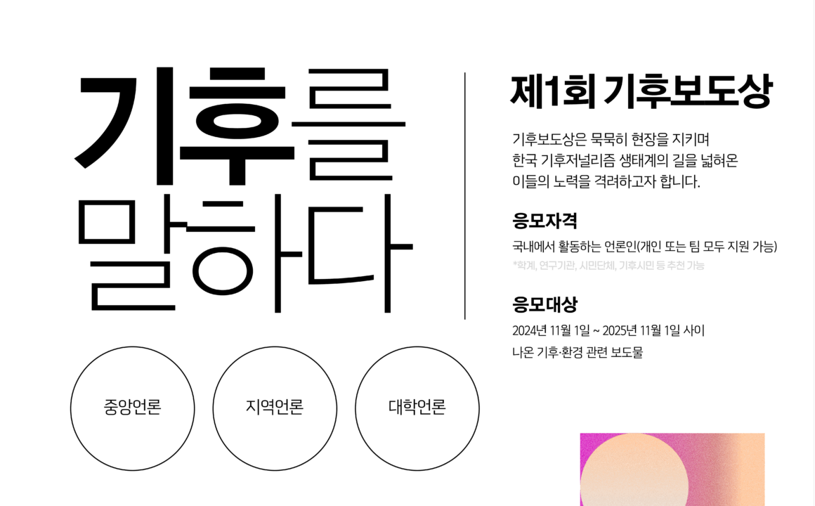 기후·환경 보도한 언론인 대상…12월 ‘기후저널리즘 심포지엄’서 시상 리영희재단과 녹색전환연구소가 기후위기 시대 언론의 역할을 조명하고 공익적 보도의 가치를 확산하기 위한 ‘제1회 기후보도상’ 공모를 시작했다. 양 기관은 3일 “기후위기 대응에 앞장선 언론인들을 격려하고, 책임 있는 기후저널리즘 문화를 확산하기 위해 이번 상을 신설했다”고 밝혔다. ‘기후보도상’은 공익성과 심층성을 갖춘 기후·환경 보도를 통해 사회적 책임을 실천한 언론인을 선정해 시상하는 제도다. 공모는 ▲중앙언론 ▲지역언론 ▲대학언론 등 3개 부문으로 나뉘며, 부문별 수상자에게는 상패와 상금 100만 원이 수여된다. 응모 자격은 국내에서 활동하는 언론인으로, 개인 또는 팀 단위로 지원할 수 있다. 기자 본인뿐 아니라 언론사, 학계, 연구기관, 시민단체 등 일반 시민의 추천도 가능하다. 심사 대상은 2024년 11월부터 2025년 11월 1일까지 보도된 기후·환경 관련 기사로, 신문·방송·라디오·영상 등 다양한 형식의 보도가 포함된다. 접수는 오는 21일 자정까지 이메일을 통해 진행된다. 제출 서류는 신청서, 기사 원문 또는 링크, 보도 개요와 설명 자료를 하나의 PDF 파일(A4 5매 이내)로 묶어 제출해야 하며, 세부 양식은 리영희재단과 녹색전환연구소 홈페이지에서 확인할 수 있다. 시상식은 오는 12월 17일 서울에서 열리는 ‘2025 기후저널리즘 심포지엄’ 공식 세션에서 진행될 예정이다. 김언경 리영희재단 이사는 “기후보도상은 현장에서 꾸준히 기후보도를 이어가는 언론인들에게 보내는 격려의 의미가 있다”며 “좋은 보도가 정치 이슈에 가려지지 않고 시민에게 더 널리 알려질 수 있는 계기가 되길 바란다”고 말했다. 오용석 녹색전환연구소 부소장은 “기후위기를 꾸준히 취재하는 기자들은 늘 조용하지만 가장 앞선 현장에서 시민들과