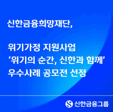 신한금융희망재단(이사장 진옥동)은 위기가정 지원사업인 ‘위기의 순간, 신한과 함께’ 우수사례 공모전에서 총 10개 기관을 선정했다고 11일 밝혔다. 이번 공모전은 현장에서 위기가정을 발굴하고 지원해 온 시·도·경찰청 및 사회복지기관의 우수 사례를 공유하고 이들의 노고를 격려하기 위해 마련됐다. 위기가정 지원사업 ‘위기의 순간, 신한과 함께’는 전국 사회복지사와 경찰관들이 현장 협업체계를 기반으로 위기가정을 조기에 발굴하고 상황