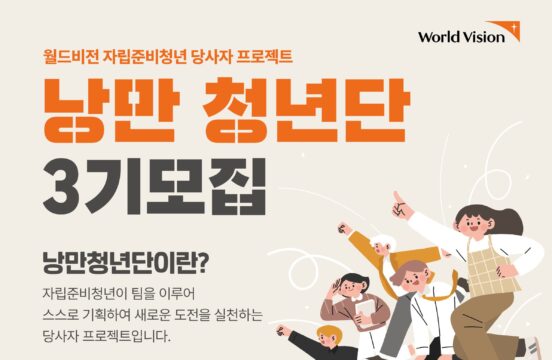 청년이 직접 기획·실행하는 자립 프로젝트…팀당 최대 2000만 원 지원 국제구호개발 NGO 월드비전이 자립준비청년 당사자 프로젝트 ‘낭만청년단’ 3기를 모집한다고 5일 전했다. ‘낭만청년단’은 자립준비청년이 팀을 이뤄 자립을 위한 활동을 스스로 기획하고 실행하는 당사자 주도형 프로젝트다. 청년들이 당면한 문제를 일시적으로 지원하는 데 그치지 않고, 목표 설정과 실행 경험을 통해 지속 가능한 자립 역량을