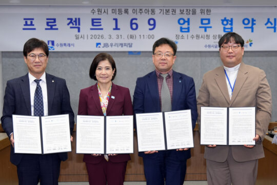 기업·지자체·민간 협력…교육·복지·의료 사각지대 해소 나서 유니세프 한국위원회는 JB우리캐피탈, 수원특례시, 수원시글로벌청소년드림센터와 업무협약을 맺고 ‘프로젝트 169’를 수원 지역에서 본격 추진한다고 31일 밝혔다. ‘프로젝트 169’는 유엔 지속가능발전목표(SDGs) 16.9번 목표인 ‘2030년까지 모든 사람에게 출생 등록을 포함한 법적 지위 부여’를 상징하는 사업이다. 기업과 지방자치단체, 민간 기관이 협력해 교육·복지·의료 사각지대에 놓인 미등록 아동을 지원하는 것이 핵심이다.
