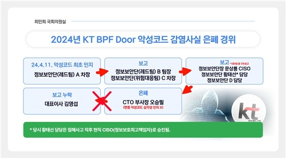 KT가 지난해 개인정보가 저장된 서버가 악성코드 ‘BPF도어(BPFDoor)’에 감염된 사실을 인지하고도 이를 대표이사와 정부에 보고하지 않은 채 정보보안단 내부에서 은폐해 온 것으로 드러났다. 21일 국회 과학기술정보방송통신위원장