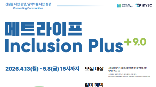 총 10개 기업 대상 6개월간 엑셀러레이팅 지원상위 5개 기업에 총 1.6억 원 지원 메트라이프생명 사회공헌재단(이사장 송영록)이 금융 포용 및 포용적 헬스케어 분야에서 사회혁신기업을 발굴 및 육성하기 위한 ‘메트라이프 인클루전 플러스 9.0(Inclusion Plus 9.0)’ 참여 기업을 모집한다. 메트라이프 인클루전 플러스는 2018년 시작된 국내 유일의 금융·헬스케어 전문 엑셀러레이팅 및 투자 프로그램이다. 메트라이프생명