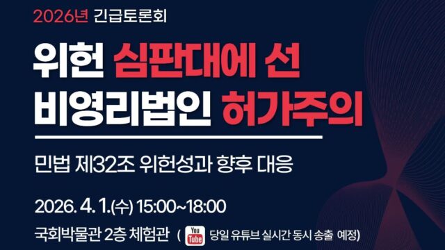 4월 1일 국회서 토론회…설립 불허·기준 자의성 논란에 제도개편 필요성 제기돼 민법 제32조에 따른 비영리법인 설립 허가제의 위헌성과 제도 개선 방향을 논의하는 긴급 토론회가 4월 1일 오후 3시, 서울 영등포구 국회박물관에서 열린다. 이번 토론회는 헌법재판소에서 실제 위헌법률심판이 진행 중인 사안을 다룬다는 점에서 주목된다. 재단법인 동천, 법무법인(유한) 태평양, 한국공익법인협회는 비영리 사단법인 설립